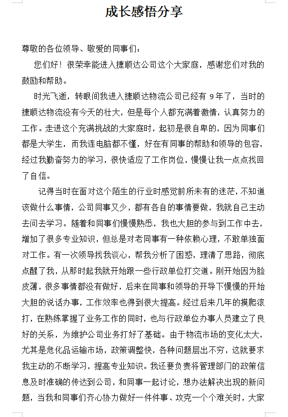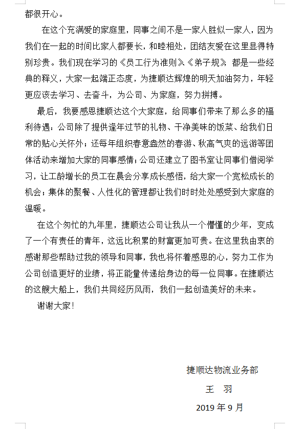 在9月份落實(shí)公司下發(fā)的《關(guān)于增強(qiáng)“傳幫帶”企業(yè)文化的通知》中,有王羽、劉凡、楊冕、付剛、翁倩5名工齡增長的員工參與到這項(xiàng)工作中來,其中王羽、劉凡、楊冕、翁倩4名員工在晨會(huì)上與大家共同分享了自己入職以來的成長歷程、工作經(jīng)驗(yàn)。王羽與大家分享入職9年工齡的感悟,文中寫道:“捷順達(dá)公司讓我從一個(gè)懵懂的少年,變成了一個(gè)有責(zé)任的青年,這遠(yuǎn)比積累的財(cái)富更加可貴?!背砷L感悟很深刻,值得我們大家學(xué)習(xí)。期待10月份轉(zhuǎn)正或工齡到期的員工能寫出更好的文章與大家分享!